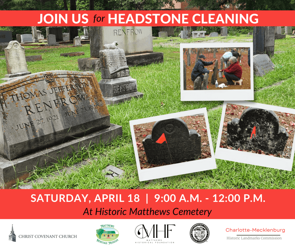 We’re excited to team up with Mecklenburg County Historic Landmarks Department’s Adventure Club and Christ Covenant Church for another Headstone Cleaning on April 18. The event will be 9:00 AM-12:00 PM.